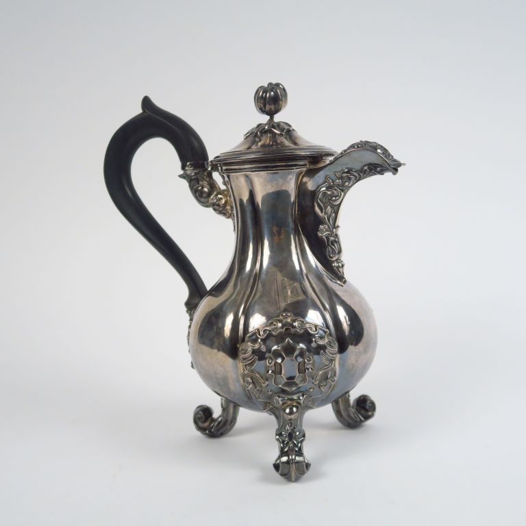 Cafetière de style rocaille en argent, poinçon Minerve, panse à décor de godrons, décor de feuillage appliqué et repoussé. Manche en ébène Poids tel. 756 g