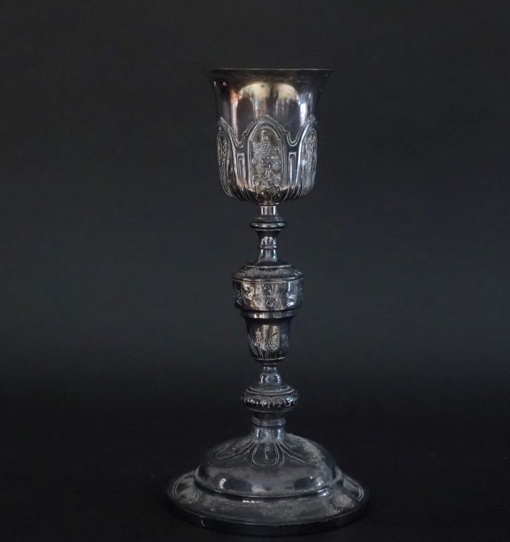 Calice fin XVIIIème - début XIXème en argent 950, poinon au 1er Coq, à décor gravé de fleurs, pampres et épis de blé. H. 31,3 cm Poids. 606 g