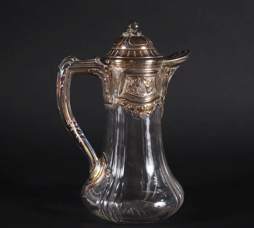 Carafe à jus de fruit en cristal taillé, monture, couvercle et anse en argent Poinçon Minerve, décor de raisins, prise du couvercle en forme de fruit. M.O Risler et Carré. H : 29.5 cm