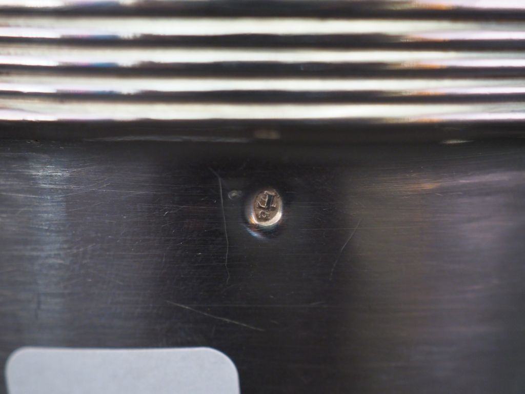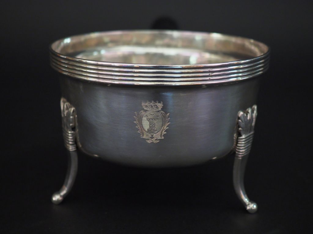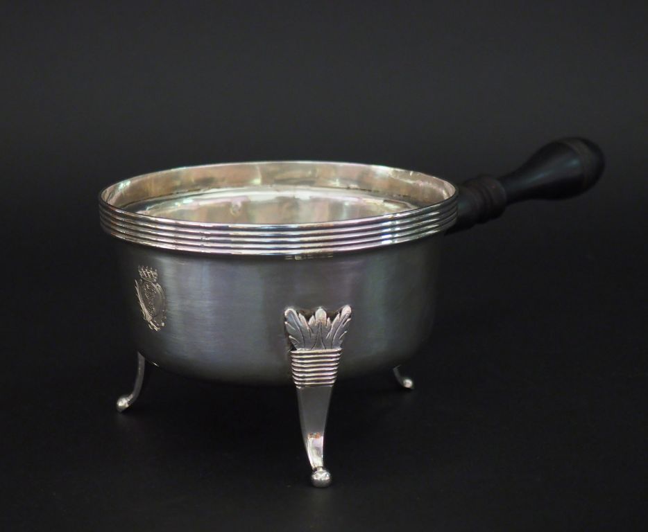 Casserole en argent, manche en bois noirci. Reposant sur trois pieds à attaches feuillagées. H. 9,3 cm Diam. 13,6 cm Poids tel. 350 g