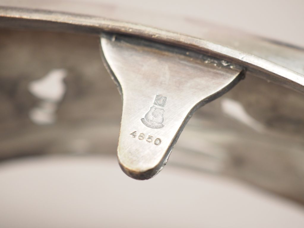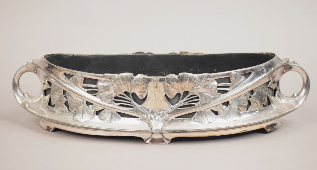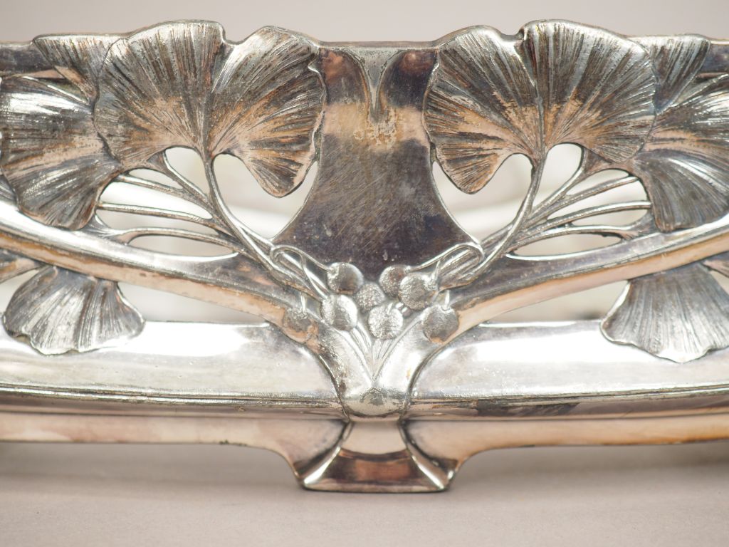 Centre de table de style Art Nouveau en métal argenté, à décor ajouré de feuilles de Ginkgo biloba. Travail de la maison Gallia. Signé. H. 11 cm Long. 48,5 cm