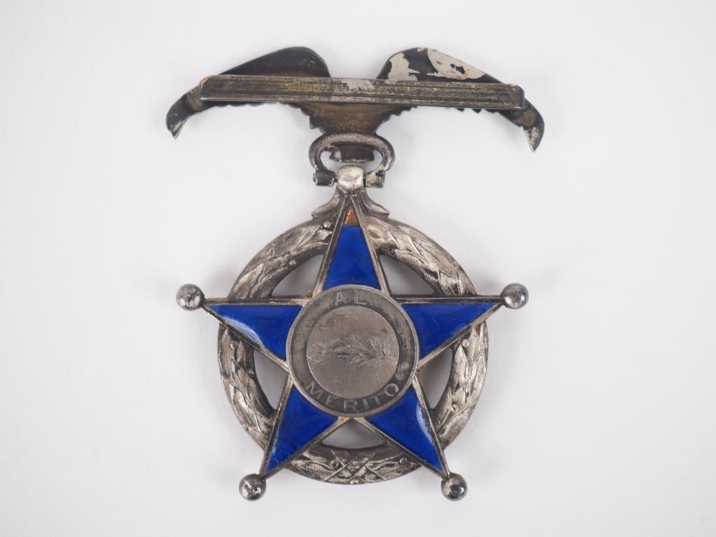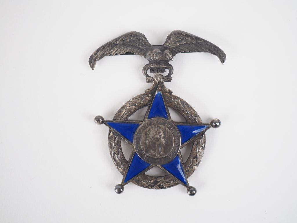 CHILI ORDRE DU MERITE (1906,1929) Etoile de 2e classe de Dieudonné Costes. Argent, émaillée bleue (éclats). Dim. 5.5 x 4.5 cm – Poids : 24.21 g T.B. à T.T.B. Provenance : -Vente des souvenirs de Dieudonné COSTES, Maître Leblanc, 10 février 1992. Expert : Arnaud de Gouvion Saint Cyr