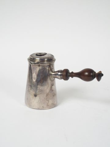 Chocolatiere armoriée, en argent XVIIIème, manche latéral en bois tourné (accidenté). Prise du couvercle à refixer. Poids sans le manche: 264 gr (LP : 10864 )