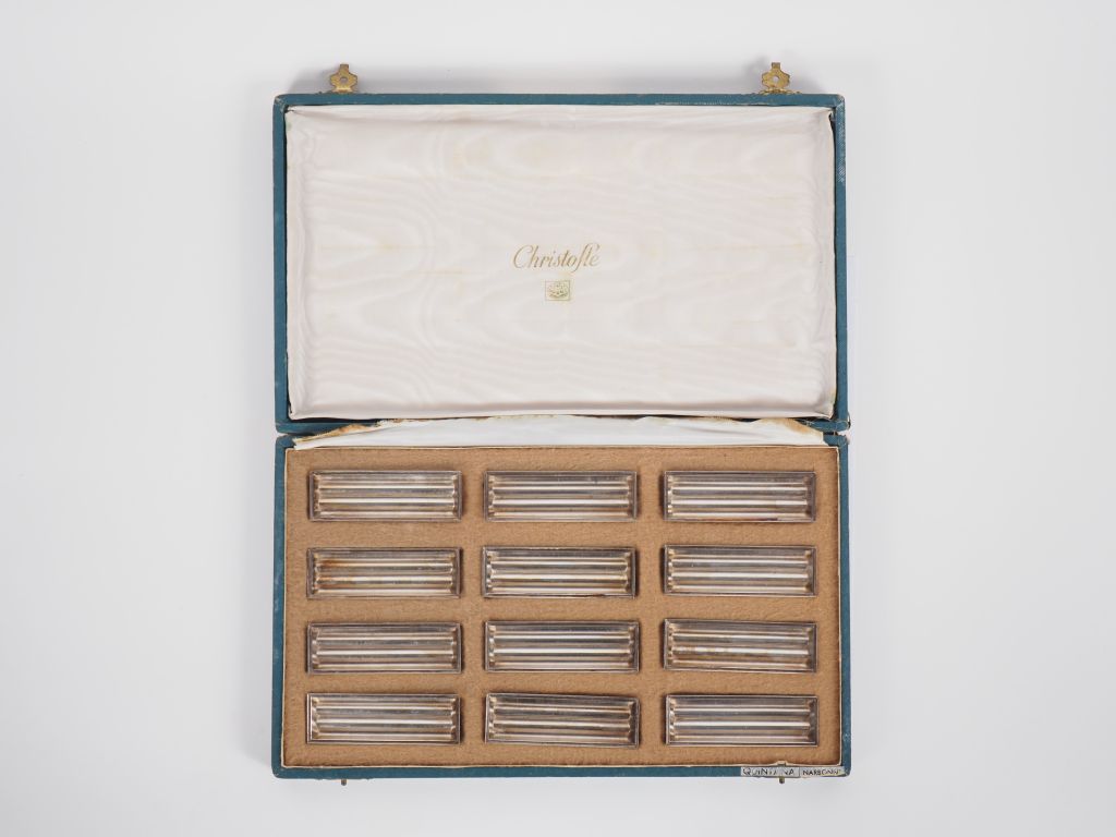 CHRISTOFLE. 12 porte couteaux de style Art Déco en métal argenté, dans leur écrin d'origine.