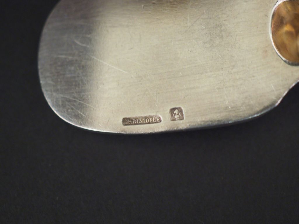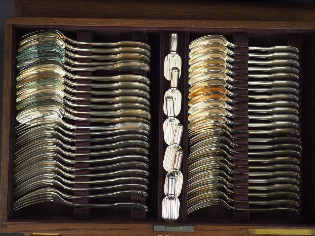 CHRISTOFLE. Ménagère en métal argenté dans son coffret, modèle à double coquille comprenant : - 12 grands couverts - 12 couverts à poisson - 12 couverts à dessert - 12 cuillères à glace - 6 porte couteaux - pièces de service dans son coffret d'origine en chêne à quatre tiroirs, poignées en bronze