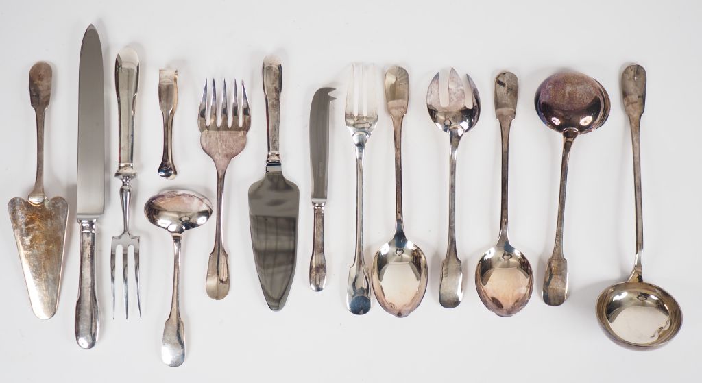 CHRISTOFLE. Ménagère en métal argenté, modèle uniplat. Comprenant : - douze grands couverts - douze couverts à entremets - douze grands couteaux - douze petits couteaux - douze couverts à poisson - douze cuillères à dessert - douze fourchettes à huitre - quatorze pièces à servir