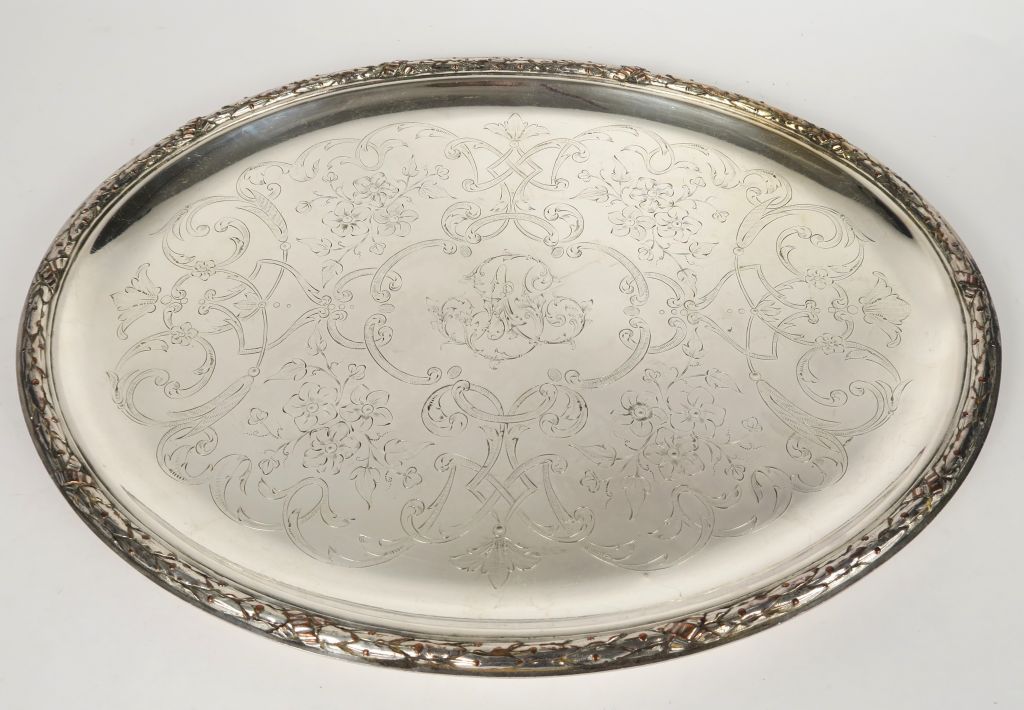 CHRISTOFLE. Plateau ovale en métal argenté, décor gravé.