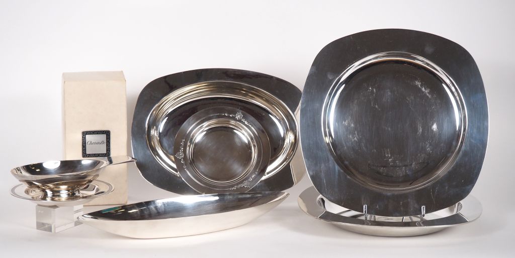 CHRISTOFLE. Saucière, 2 jattes rondes , un plat creux ovale, un grand ravier en métal argenté , Signés On y joint 2 assiettes à bouillie