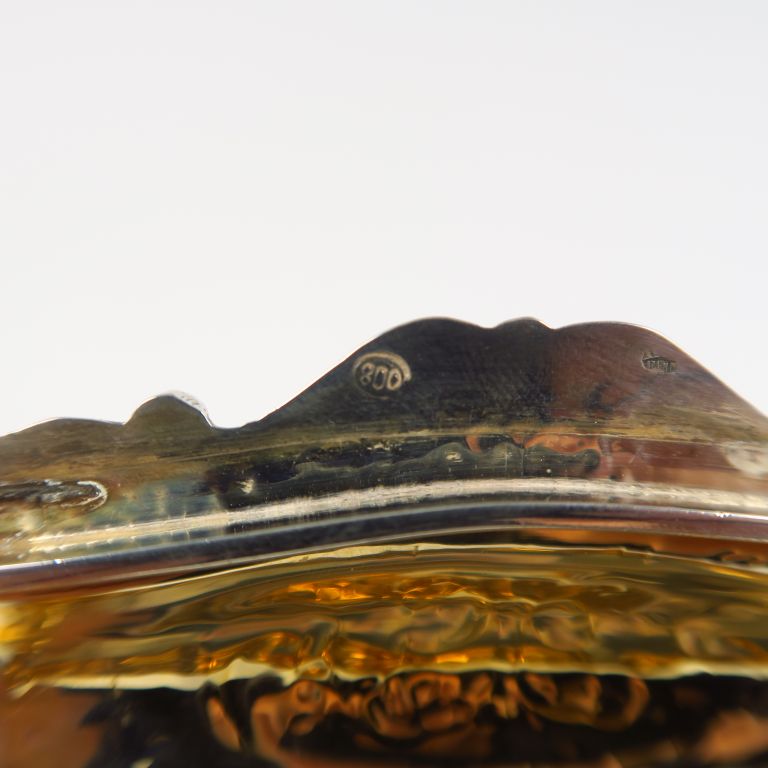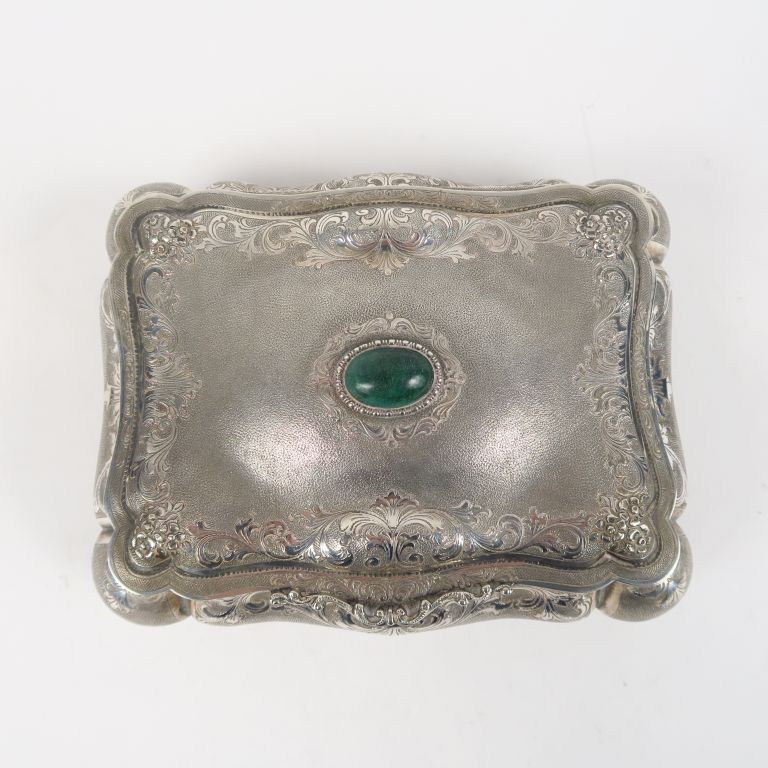 Coffret de style rocaille en argent 800 millièmes, à décor de rinceaux feuillagés, couvercle orné d'un cabochon de malachite. Poids. 797 g