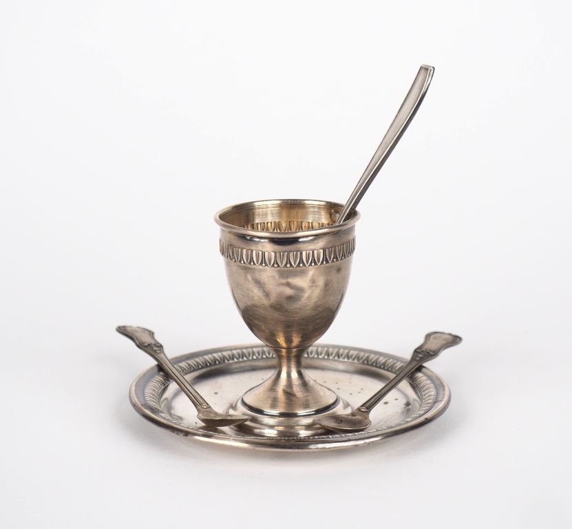 Coquetier de style Louis XVI en argent, poinçon Minerve, à décor de frises de feuilles d'eau. On y joint une cuillère à œuf de style Art déco en argent, poinçon Minerve et deux petites pelles à sel en argent, poinçon Minerve, modèle feuillagé et monogrammé. Poids. 75 g