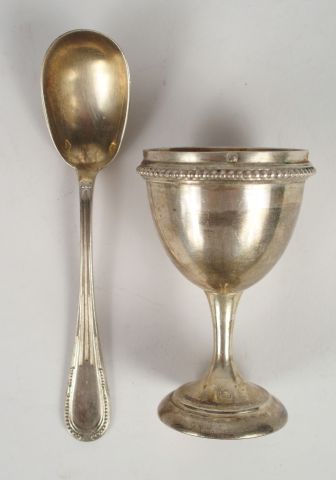 Coquetier et sa cuillère de style Louis XVI en argent et vermeil, poinçon Minerve. Gravé René. Poids : 68 g