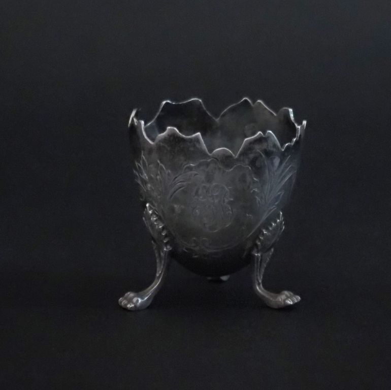Coquetier tripode en forme de demi coquille d'œuf en argent 925, poinçon Minerve, à décor gravé de fleurs et de cartouche monogrammé. Reposant sur trois pieds griffe. H. 5 cm Poids. 32 g