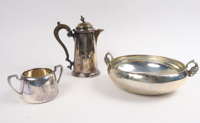 Coupelle à anses, cafetière monogrammée, base de sucrier, l'ensemble en métal argenté
