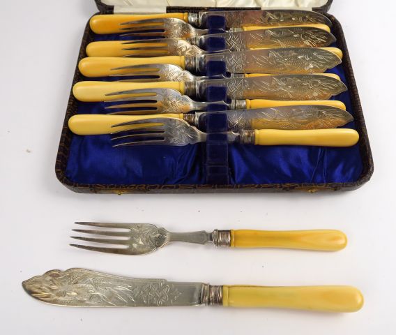 Lot de Couverts à poisson anglais en métal argenté et ivoirine. Dans leur cof au prix de 30 à 40 € en vente aux enchères par l'hôtel des ventes Primardeco