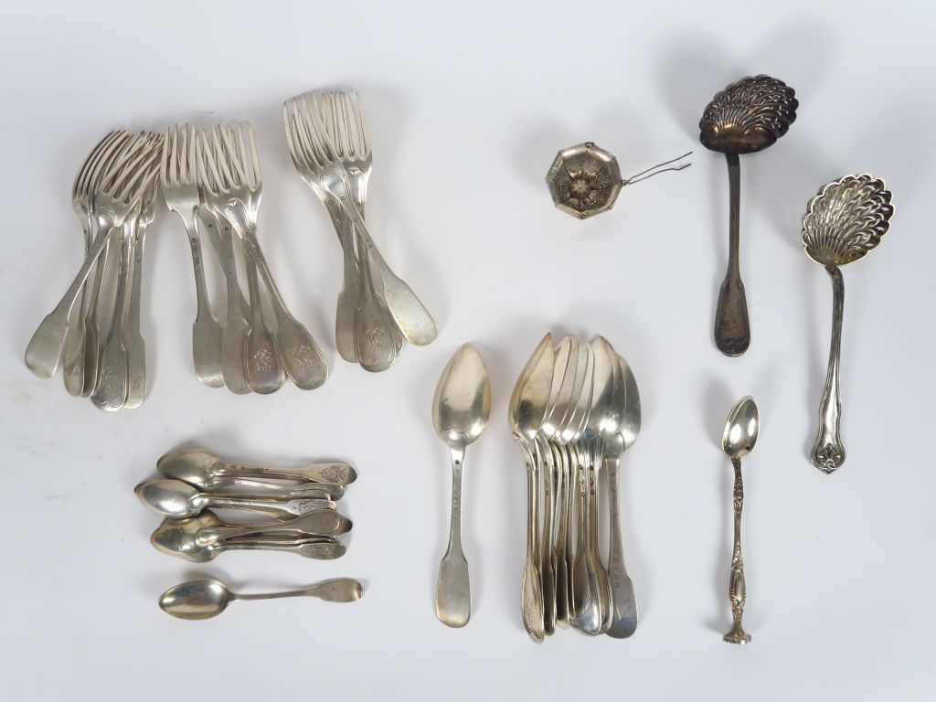 Couverts dépareillés en argent. Poids. 2130 g On y joint une saupoudreuse en argent, une passette à thé, une saupoudreuse et une cuillère à cocktail en argent. Poids de l'ensemble. 90 gr
