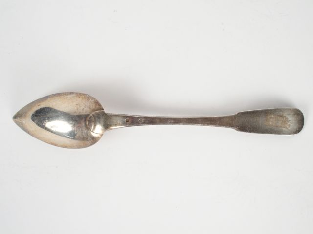 Cuillère à ragoût en argent, poinçon Minerve (à vérifier). MO : NI. Longeur : 27,5 cm. Poids : 120 g