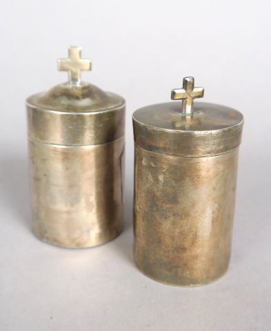 Deux ampoules à huile sainte XVIIIe en argent. Poids : 59 g (restauration à l'un)