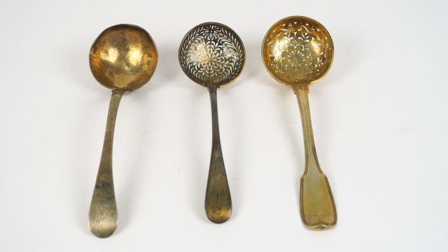 Deux louches à crème et un saupoudroir en argent. 256 g