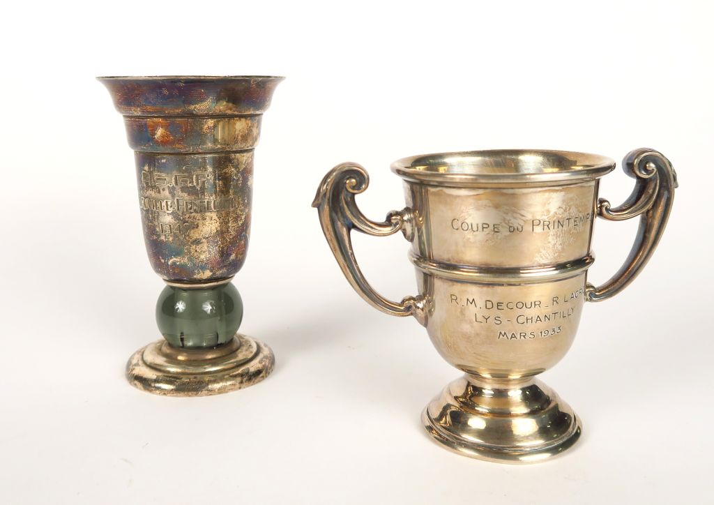 Deux petites coupes de prix en métal argenté, l'une à anses, l'autre de la maison Ravinet Denfer.