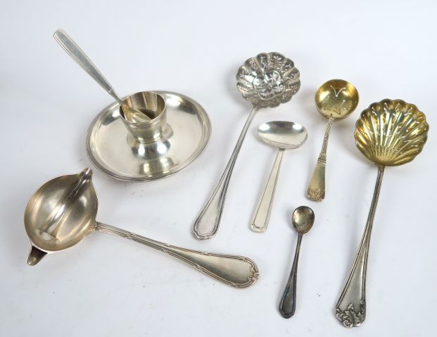 Différentes cuillères et un coquetier, l'ensemble en métal argenté