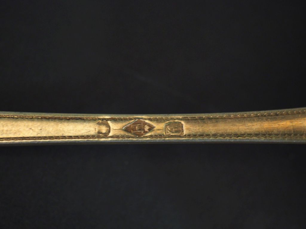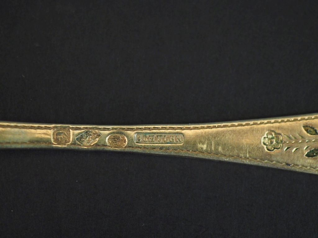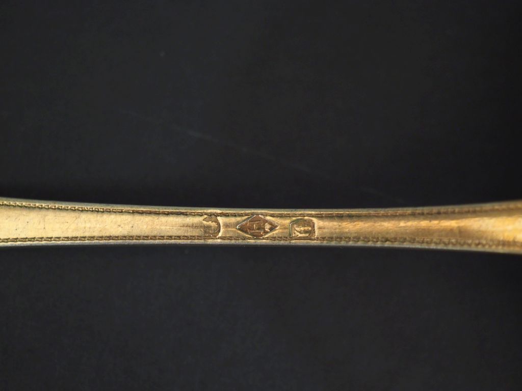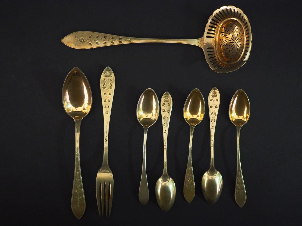 Différents couverts XIXème en vermeil comprenant un saupoudroir, un couvert à dessert, 5 petites cuillères. Poids : 186 g