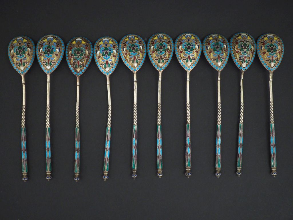 Dix petites cuillères à thé en vermeil et émail cloisonné. Moscou, début du XXe siècle. Le dos du cuilleron à décor floral en émail cloisonné polychrome sur fond amati, le bord de perle en émail bleu ciel. Le manche en partie torsadé est terminé par une section à pans en émail cloisonnée surmontée d'un bouton décoré de perles d'émail. Poinçons : 84, Moscou après 1908 et orfèvre « ЕО» (non répertorié). Longueur : 13.8 cm , Poids brut : 210 g