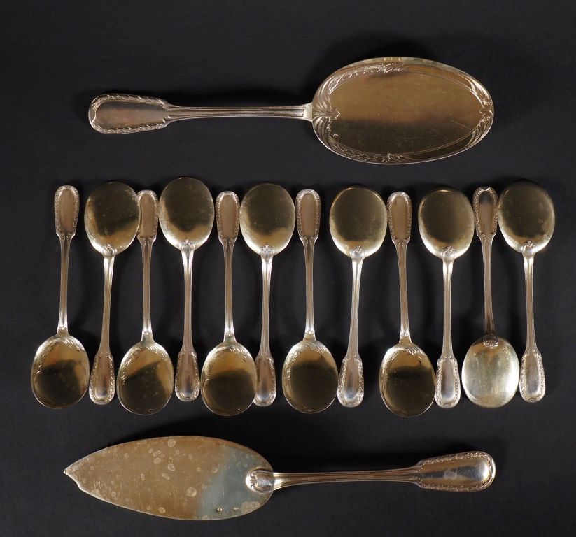 Douze cuillères à glace en vermeil, poinçon Minerve. M.O : E.P vers 1900. Poids : 320 g et deux pelles Poids : 260 g