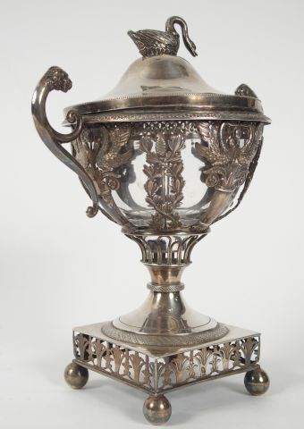 Drageoir de style Empire en cristal et argent, poinçons dépareillés, couvercle rapporté (restauration à une anse). Poids: 432gr