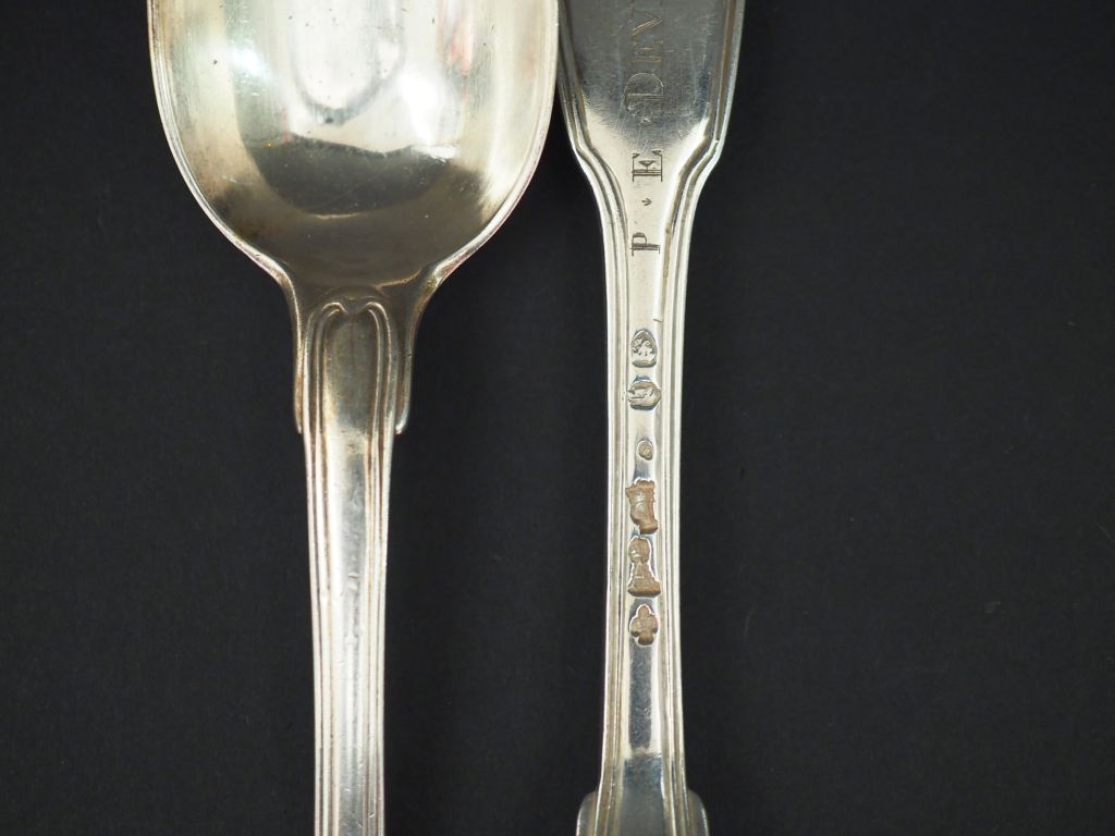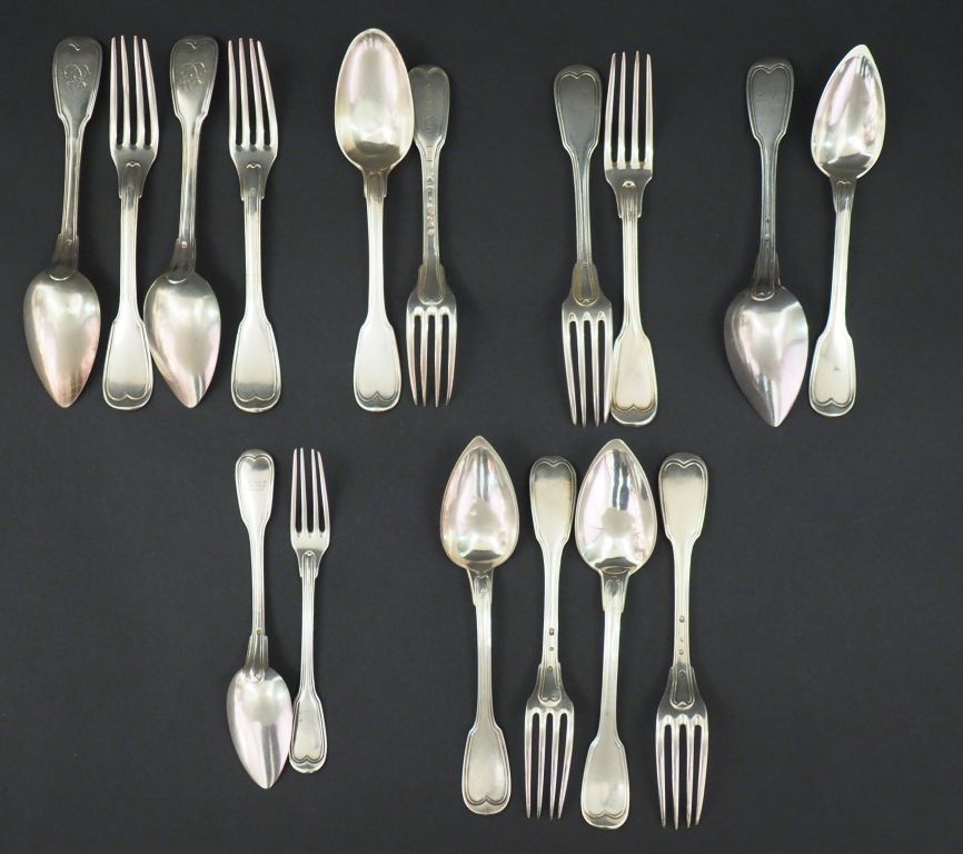 Ensemble comprenant : - deux différentes cuillères en argent XVIIIème, modèle à filet. Monogrammées. - deux grands couverts en argent, poinçon Minerve, modèle à filet. Monogrammés. M.O : Mattreau - deux grands couverts Restauration en argent, poinçon Vieillard, modèle à filet. (maitres orfèvres dépareillés) - deux grandes fourchettes en argent, poinçon Minerve. Monogrammées. - un couvert à entremets en argent, poinçon Minerve, modèle à filet. Monogrammé. - deux grandes cuillères dépareillés en argent. Poids. 1236 g