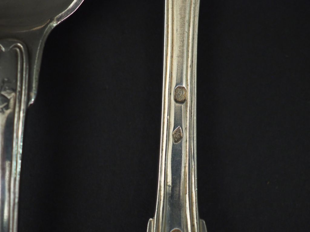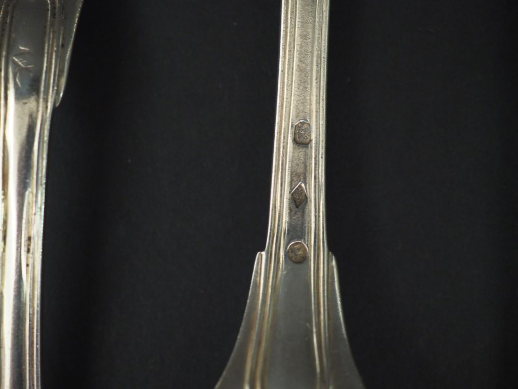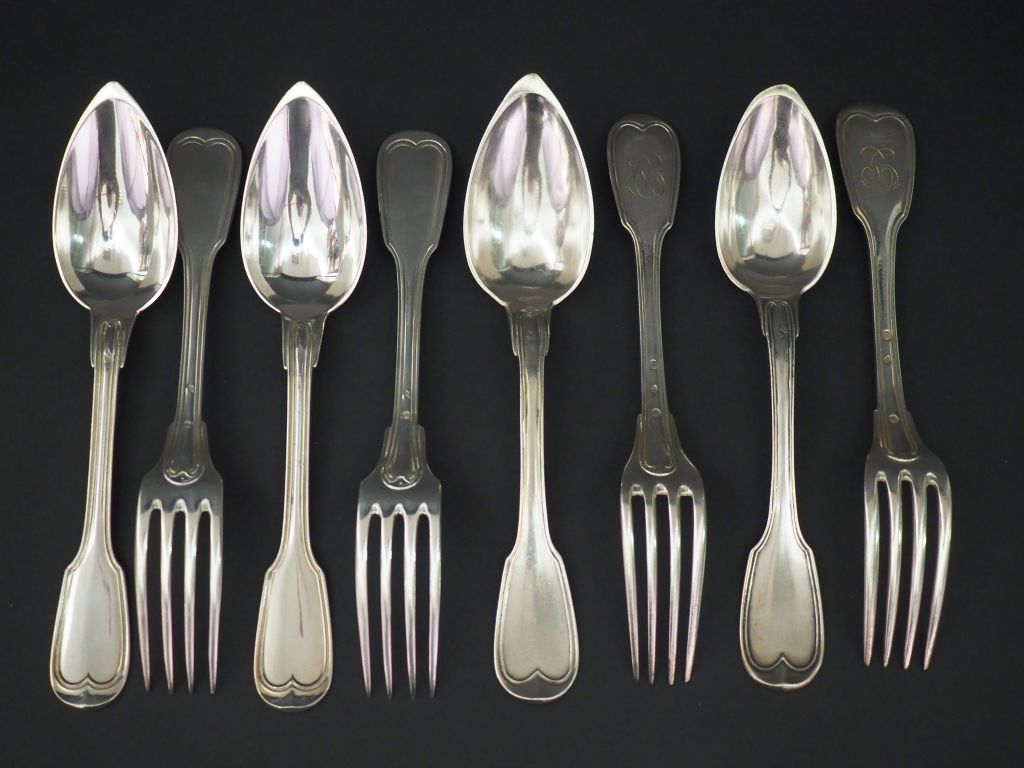 Ensemble comprenant : - deux grands couverts Restauration en argent, poinçon Vieillard, modèle à filet. Monogrammés. - deux grands couverts en argent, poinçon Minerve, modèle à filet. M.O : T H Poids. 626 g