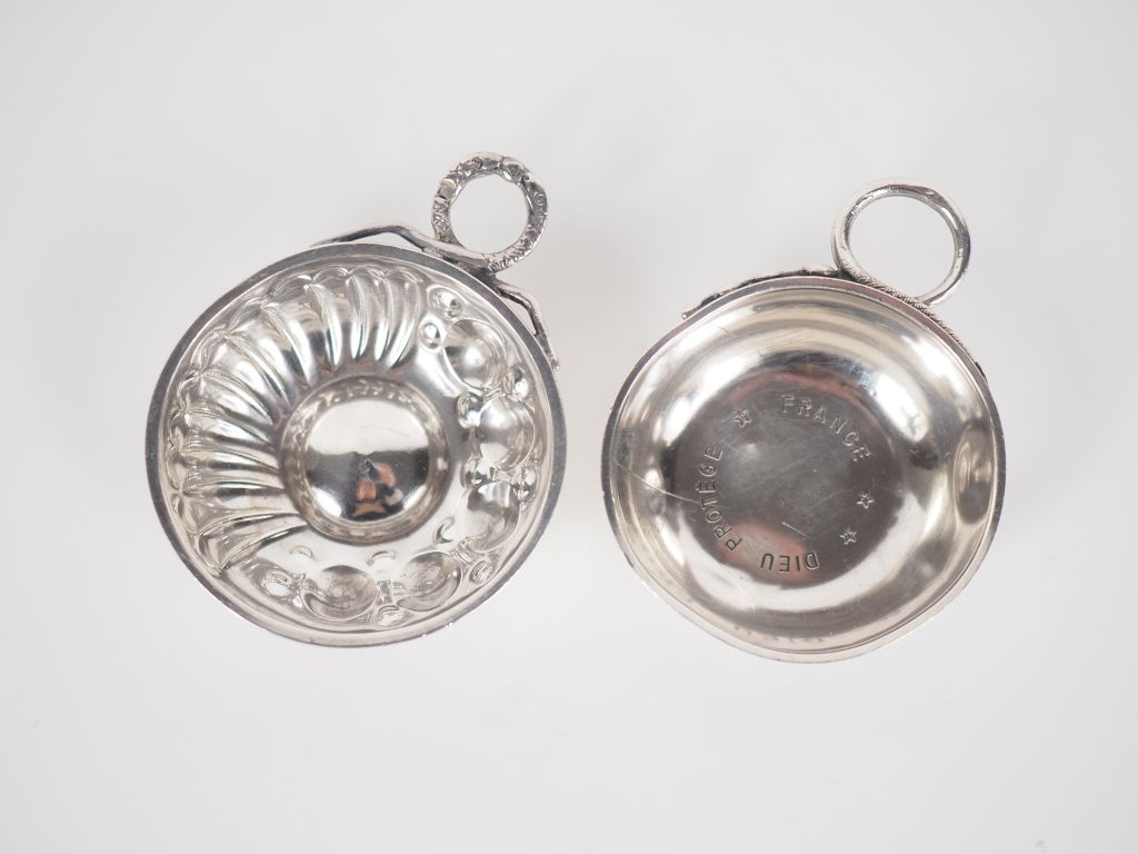 Ensemble comprenant deux petits tastes-vins en argent 925, poinçon Minerve. L'un, à décor de côtes torses et pastilles, l'autre gravé "Dieu protège. France". Les anses, à décor de serpents. Diam. 5 cm Poids. 45 g