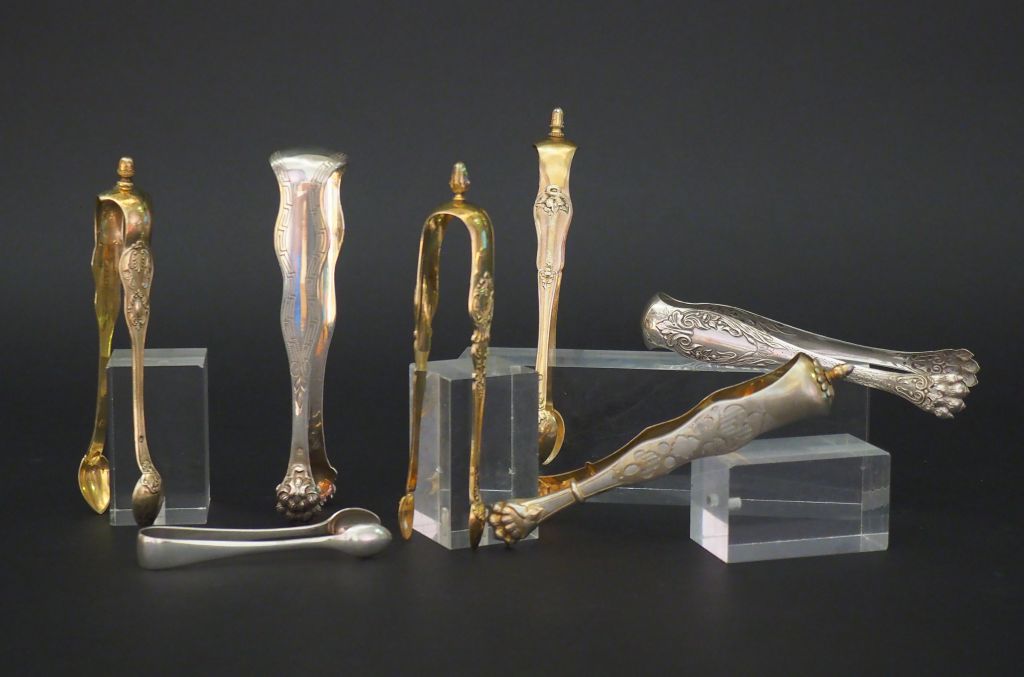 Ensemble comprenant six différentes pinces à sucre en argent et/ou vermeil, poinçon Minerve. On y joint une pince à sucre en argent anglais. Poids. 250 g