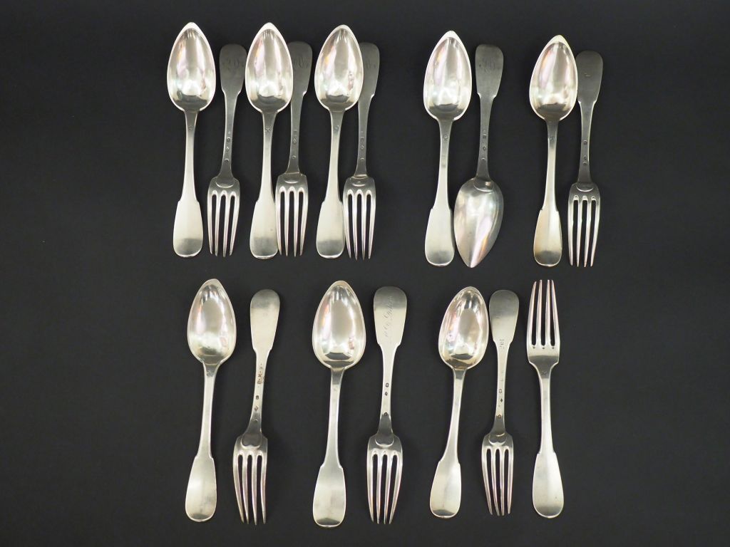 Ensemble comprenant : - trois grands couverts et deux cuillères Restauration en argent, poinçon Vieillard, modèle uniplat. Monogrammés. M.O : B.C - un grand couvert Restauration en argent, poinçon Vieillard, modèle uniplat. Monogrammé. - un grand couvert Restauration en argent, poinçon Vieillard, modèle uniplat. Monogrammé. - un grand couvert Restauration en argent, poinçon Vieillard, modèle uniplat. Monogrammé. - un grand couvert et une fourchette Restauration en argent, poinçon Vieillard, modèle uniplat. Monogrammés. Poids. 1350 g