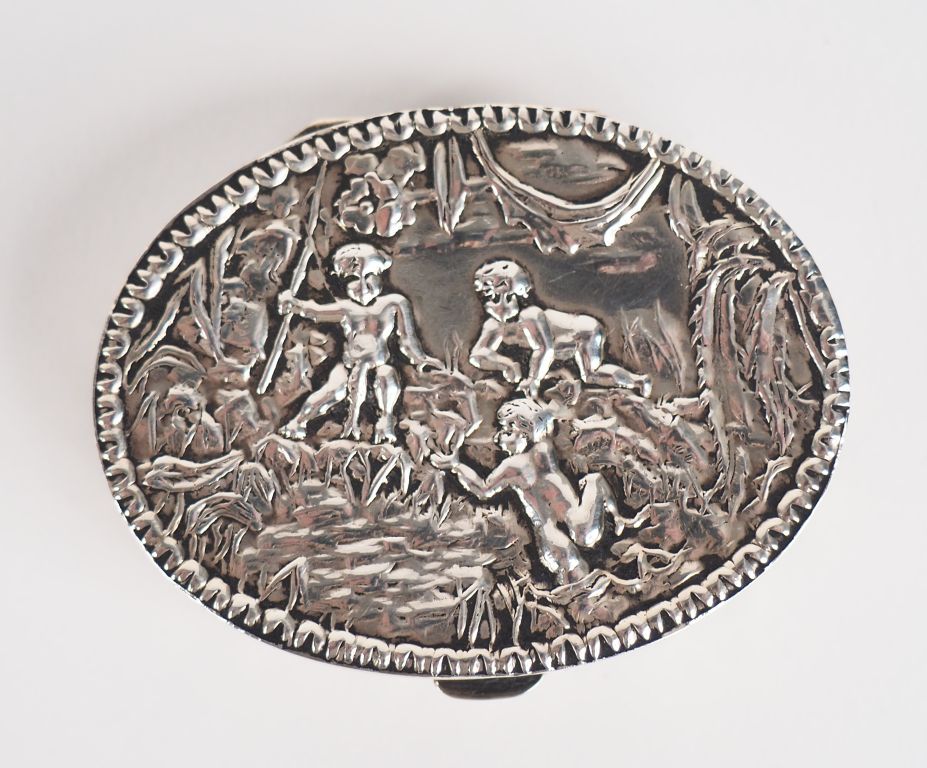 Ensemble comprenant : - un étui à cigarettes de forme bombée en argent 800, à décor de motifs géométriques. 9 x 8 cm - une petite boite à pilules de forme ovale en argent 800, à décor en repoussé sur le couvercle d'amours jouant. La tranche de la boite, à décor de frises de fleurs. 1,5 x 5,4 x 4 cm Poids. 114 g
