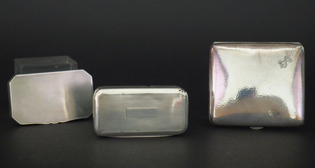 Ensemble comprenant : - un étui à cigarettes en argent 800 martelé, de forme légèrement bombée, à décor de monogramme. 9 x 8 cm - une boite à pilules en argent anglais, à décor guilloché. - une boite à pilules en argent, poinçon Minerve, à décor guilloché. Gravée. (petits accidents) Poids. 200 g