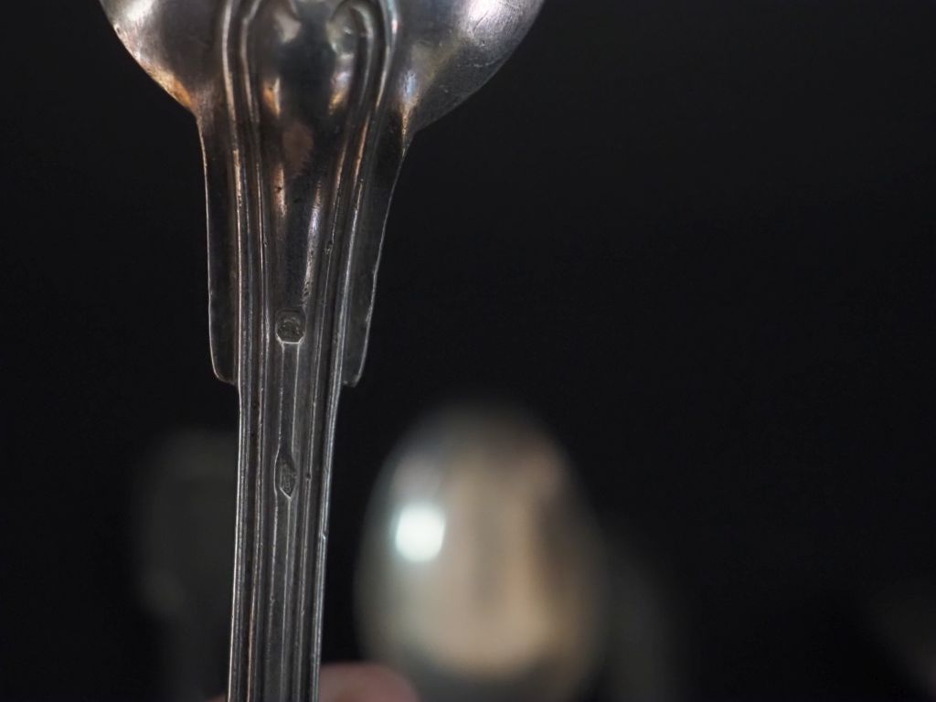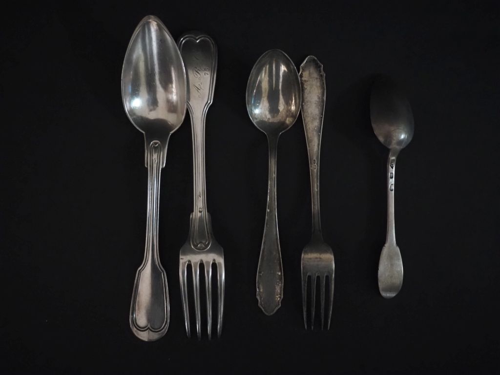Ensemble comprenant : - un grand couverts en argent 925, poinçon Minerve, modèle à filet. Monogrammé. - un couvert d'enfant en argent espagnol 915. - une petite cuillère en argent. Poids. 254 g