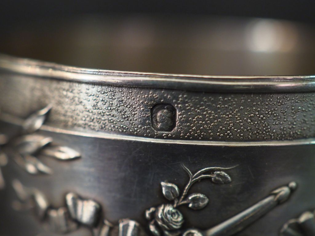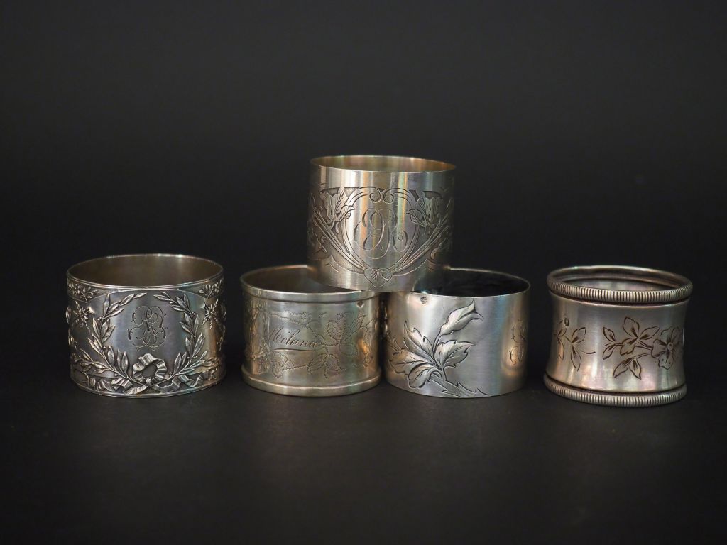 Ensemble comprenant : - un rond de serviette en argent, poinçon Minerve, à décor au repoussé de marguerite. Monogrammé. H. 3,5 cm - un rond de serviette en argent, poinçon Minerve, à décor gravé de fleurs et de cartouche, agrémenté de godrons. H. 3,9 cm - un rond de serviette en argent, poinçon Minerve, à décor de fleurs et de cartouche monogrammé. H. 4 cm - un rond de serviette en argent, poinçon Minerve, à décor gravé de fleurs et d'un éventail marqué Mélanie. H. 3,6 cm - un rond de serviette en argent, poinçon Minerve, à décor de couronne de feuilles de laurier, carquois, fleurs, et nœud de ruban. Monogrammé. H. 3,9 cm Poids. 166 g