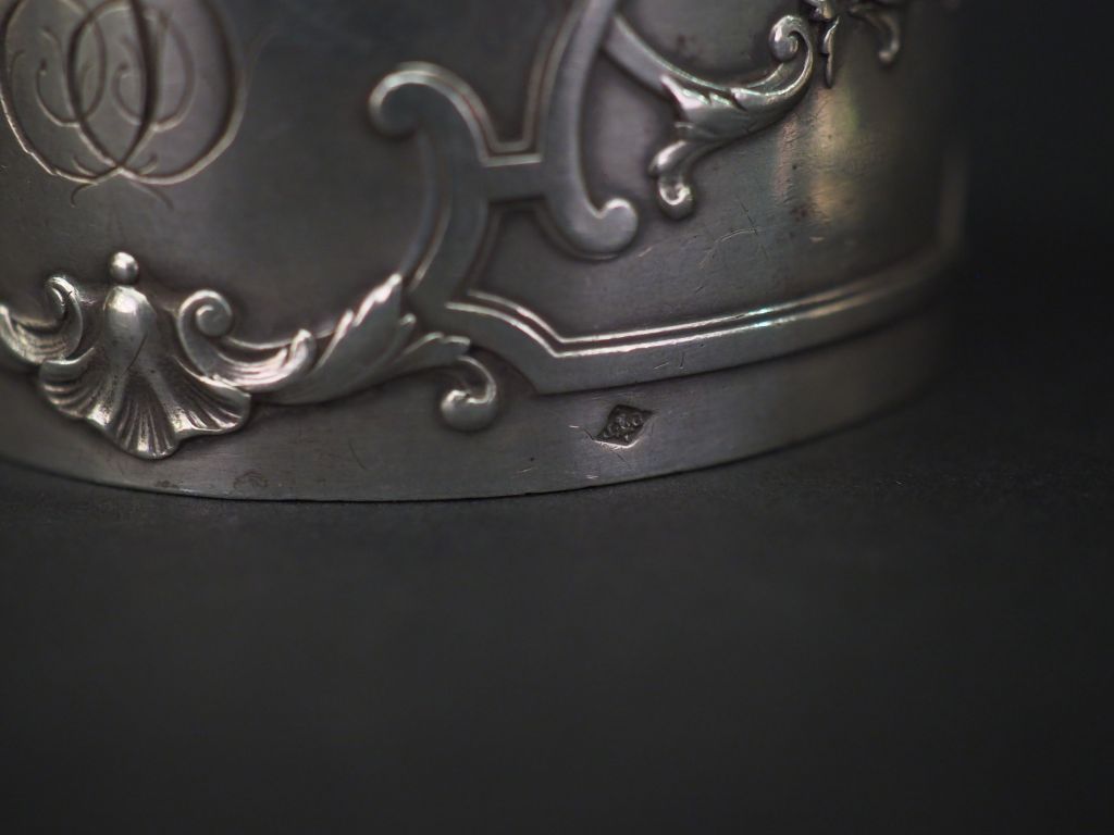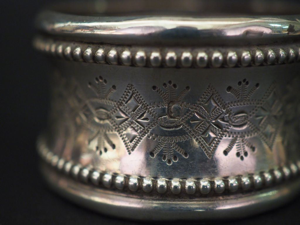 Ensemble comprenant : - un rond de serviette Napoléon III en argent, poinçon Minerve, à décor de rinceaux et fleurons. Monogrammé. - un rond de serviette en argent, poinçon Minerve, à décor de frises de rinceaux et de fleurs. Monogrammé. - un rond de serviette Napoléon III en argent, poinçon Minerve, à décor de pampres de vigne, de rangs de perles et de semis de fleur. Monogrammé. M.O : PB - un rond de serviette en argent, poinçon Minerve, à décor d'une frise de motifs géométriques et d'un cartouche monogrammé. Poids. 139 g