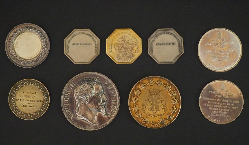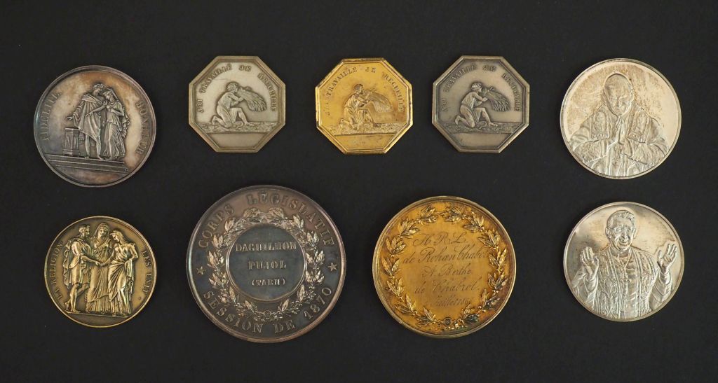 Ensemble comprenant : - une médaille en argent "Corps législatif, session de 1870". Diam. 52 mm - une médaille en argent et vermail offerte par Monsieur de Rohan Chabot à Madame Berthe de Chabrol en 1860, à décor de monogramme surmonté d'une couronne et entouré d'une couonne de feuilles de laurier. Diam. 47 mm - trois jetons d'honneur à pans coupés en argent et argent et vermeil. - deux jetons en argent figurant le pape Jean-Paul II. Diam. 39 mm - une médaille de mariage en argent, à décor à l'antique. Diam. 40 mm - une médaille de mariage en argent et vermeil "Le religion les unit". Diam. 37 mm Poids. 249,67 g