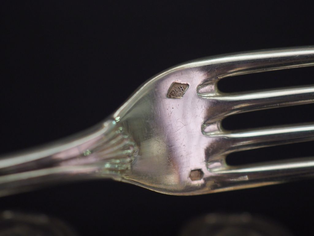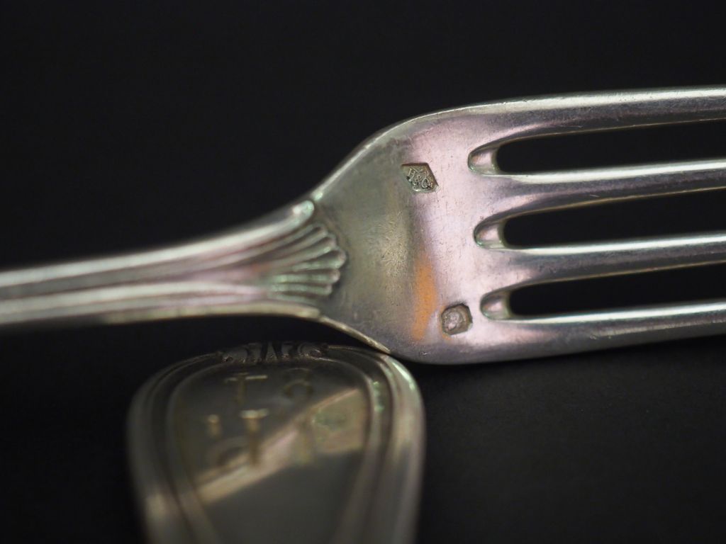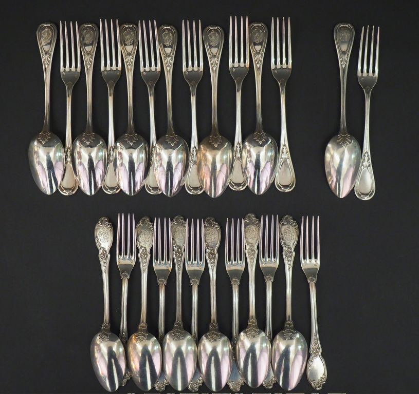 Ensemble comprenant : - une suite de six couverts à entremets de style Louis XV en argent, poinçon Minerve, modèle à cartouche feuillagé. Monogrammés. H Cie. On y joint un couvert à entremets du même modèle en argent, poinçon Minerve. Monogramme dépareillé. - une suite de six couverts à entremets en argent, poinçon Minerve, à décor de branchage fleuri. Monogrammés. Poids. 1338 g