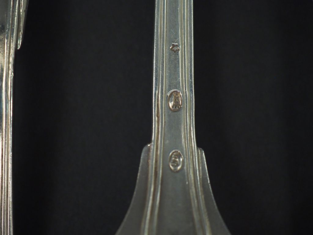 Ensemble comprenant : - une suite de six grandes cuillères Restauration en argent, poinçon Vieillard, modèle à filet. Armoriées. - une suite de six grandes fourchettes en argent, poinçons dépareillés, modèle à filet. Armoriées. Poids. 1089 g