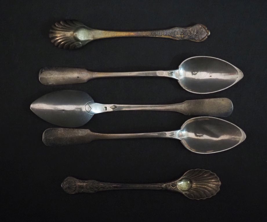 Ensemble comprenant : - une suite de trois cuillères à moka en argent 925, poinçon Minerve. Long. 12,4 cm - une paire de cuillères à sel de style Louis XV en argent doré 925, poinçon Minerve. Le cuilleron en forme de coquille. Long. 9,7 cm Poids. 47 g