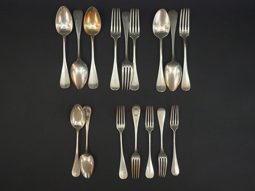 Ensemble comprenant : - une suite de trois grandes cuillères en argent, poinçon Minerve, modèle à baguette. Monogrammées. - une suite de trois grandes fourchettes en argent, poinçon Minerve, modèle à baguette. Monogrammées. - deux grandes cuillères et une grande fourchette en argent, poinçons et modèles dépareillés. - deux cuillères à entremets en argent, poinçon Minerve, modèle à cartouche monogrammé. M.O : H.S - cinq fourchettes à entremets en argent, poinçon Minerve, modèles dépareillés. Monogrammées. Poids. 1034 g