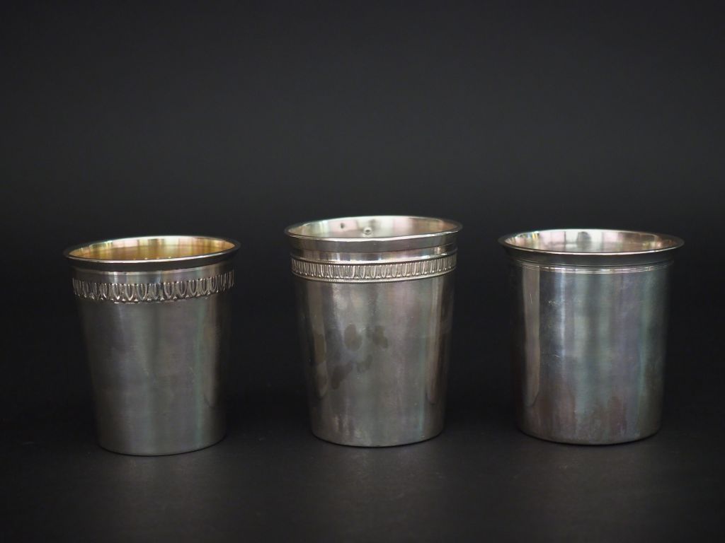 Ensemble comprenant : - une timbale à fond plat en argent, poinçon Minerve, à décor d'une frise de feuilles d'eau. H. 8 cm - une timbale à fond plat en argent, poinçon Minerve, à décor d'une frise de feuilles d'eau. H. 7,5 cm - une timbale à fond plat et bord évasé en argent, poinçon Minerve. H., 7,5 cm (anciennement monogrammée) Poids. 153 g