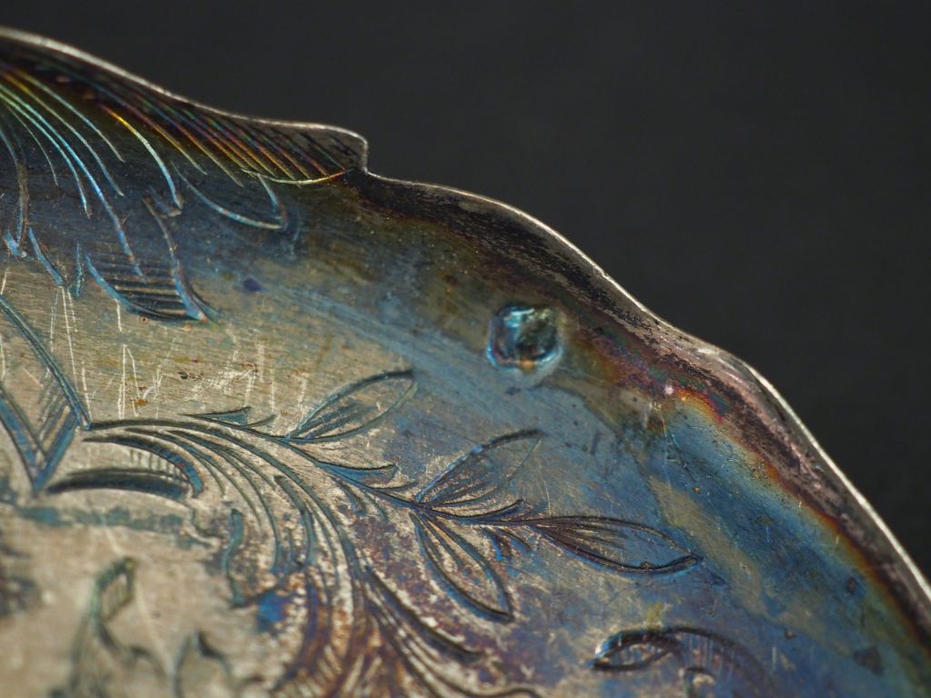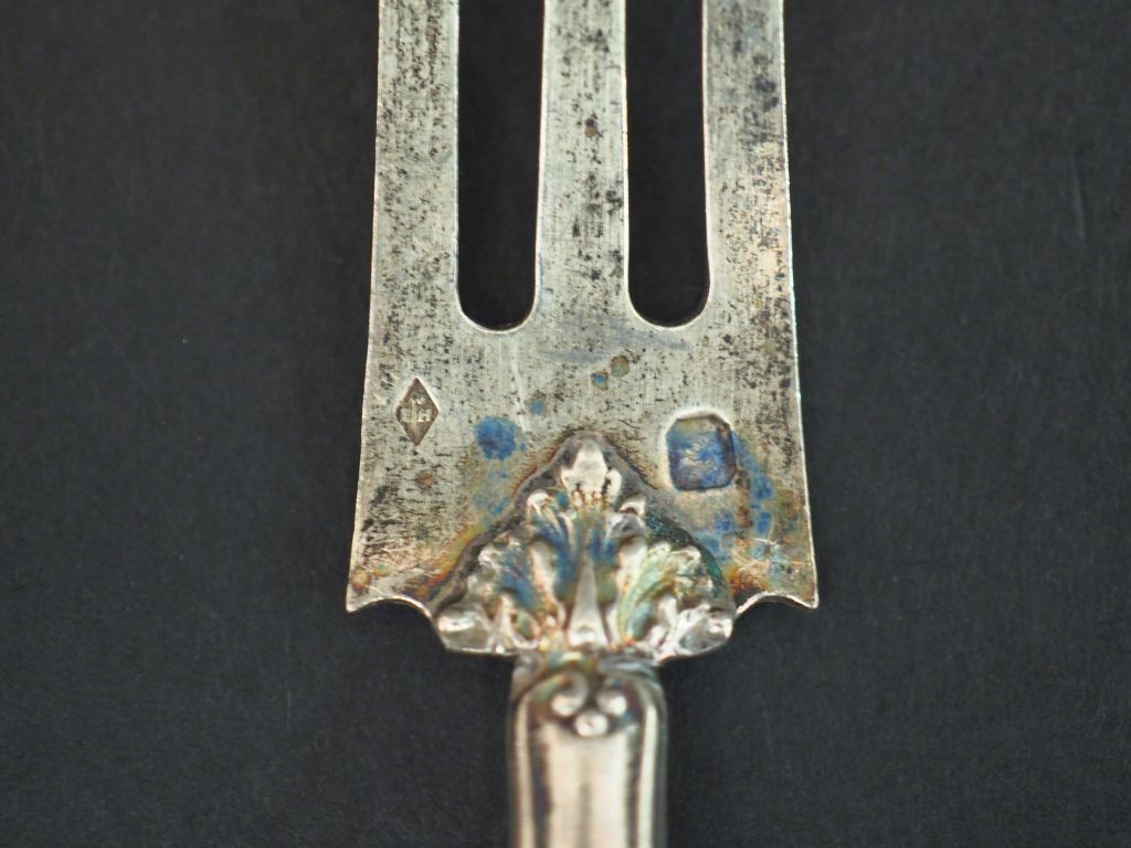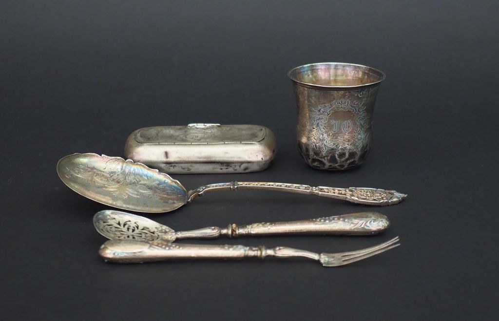 Ensemble comprenant : - une timbale de forme tulipe en argent, poinçon Minerve, à décor de branchages fleuri et de monogramme dans un cartouche feuillagé. H. 6,6 cm Poids. 42 g (enfoncements) - une boite couverte en argent, à décor de monogramme sur le couvercle. 2,5x 10,5 x 5,7 cm Poids. 71 g (petits enfoncements) - une cuillère à servir la glace en argent, poinçon Minerve, à décor de rinceaux feuillagés et de mascaron. Joli manche, à décor ajouré. Long. 22 cm Poids. 74 g - deux pièces de nécessaire à douceur en argent et argent fourré poinçon Minerve, à décor de muguet. Poids tel. 59 g