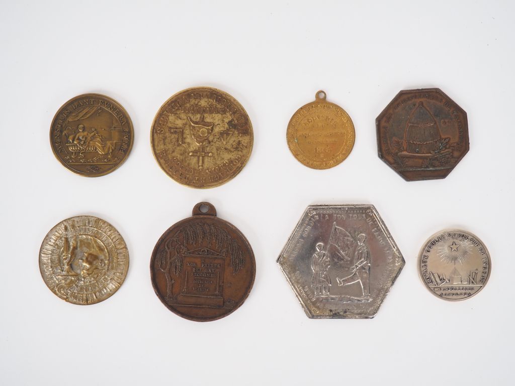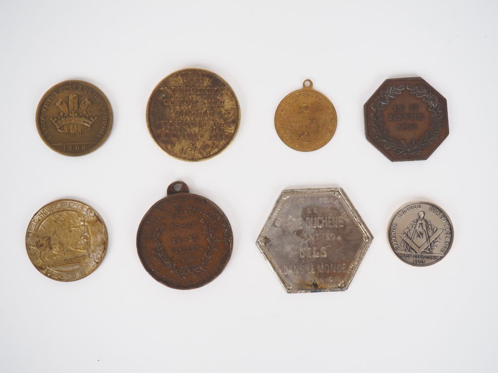 Ensemble de 8 jetons ou médailles maçonniques comprenant : - Chambre des entrepreneurs de maçonnerie 1810. - Souvenir des banquets fraternels Lille 1848 - Société ouvrière "les voraces" lyon 1842. - Médaille de naissance du fils de Jacques II roi d'Angleterre (refrappe moderne). - Ligue Napoléonienne à l'étranger, Livourne en argent (refrappe moderne). Poids. 11,5 g. - Fondation du journal "Le père Duchène" 1848. - Honneur aux parisiens (Louis Philippe), les trois glorieuses. - Orient du Havre, loge des "3H".