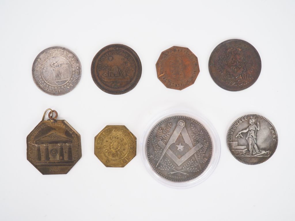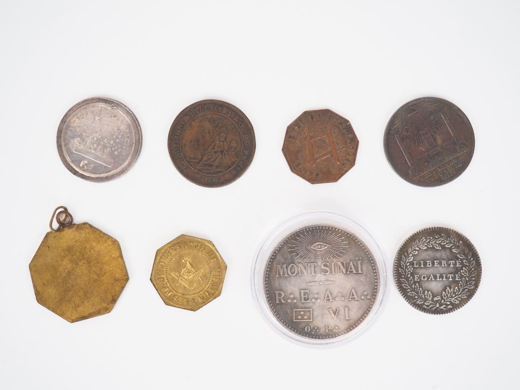 Ensemble de 8 jetons ou médailles maçonniques comprenant : - Orient de Paris, loge "les amis triomphants" 1808. - Orient de Saint Quentin, loge "la philantropie" en argent. Poids. 8 g. - Loge "les amis de la liberté". - Loge "mont Sinaï". - Orient de Cognac, loge "les frères sincères amis de l'union". - Orient de Paris, loge "du point parfait". - Orient de Paris, loge "Jérusalem des vallées egyptiennes". - Orient du Havre, loge de "3H" 1813.