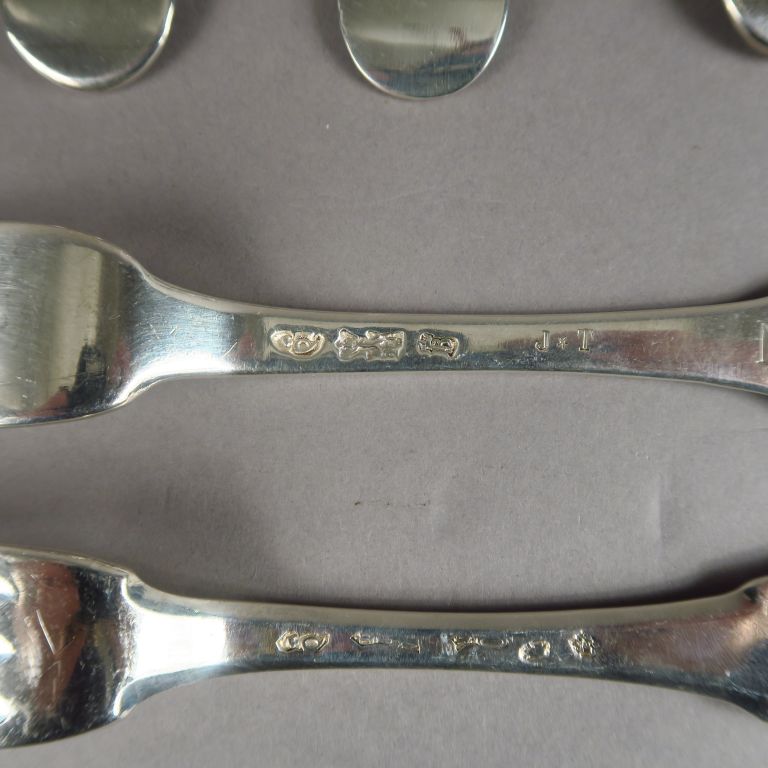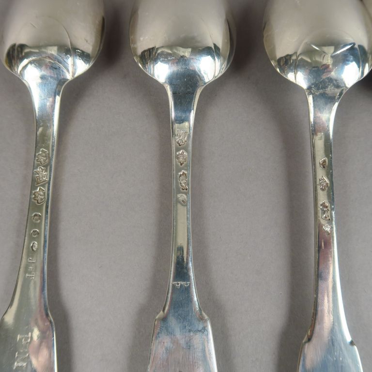 Ensemble de cinq cuillères et deux fourchettes XVIIIème en argent, poinçons dépareillés. Poids. 572 g