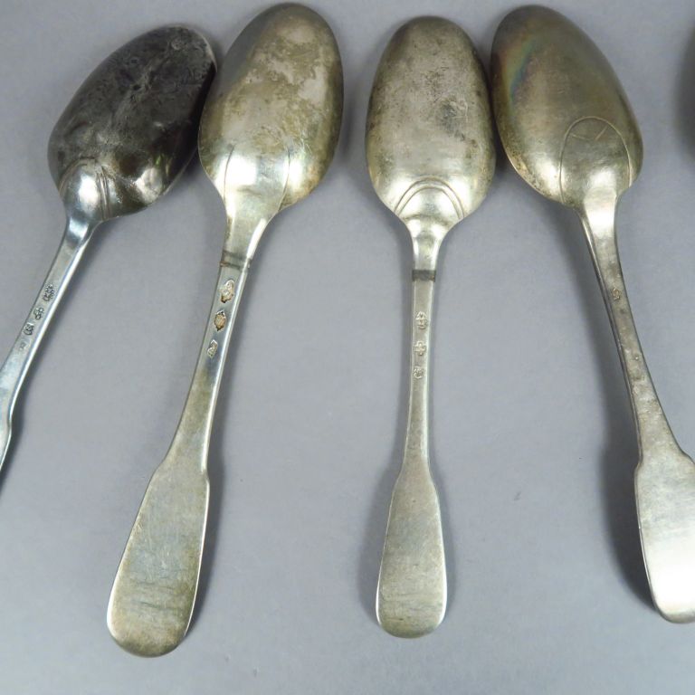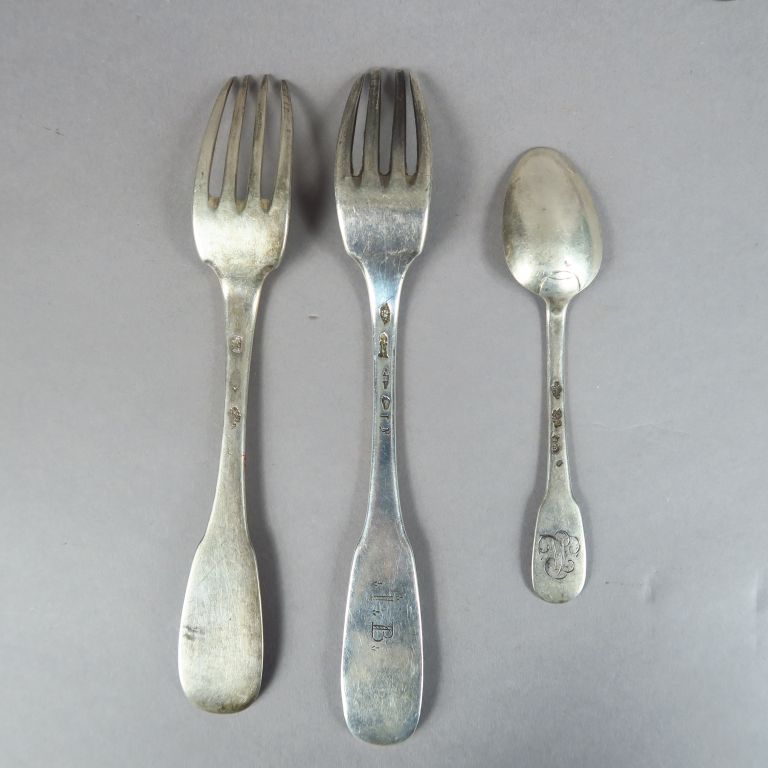 Ensemble de huit grandes cuillères, une petite cuillère et deux fourchettes XVIIIème en argent. Poids. 811 g (poinçons dépareillés)
