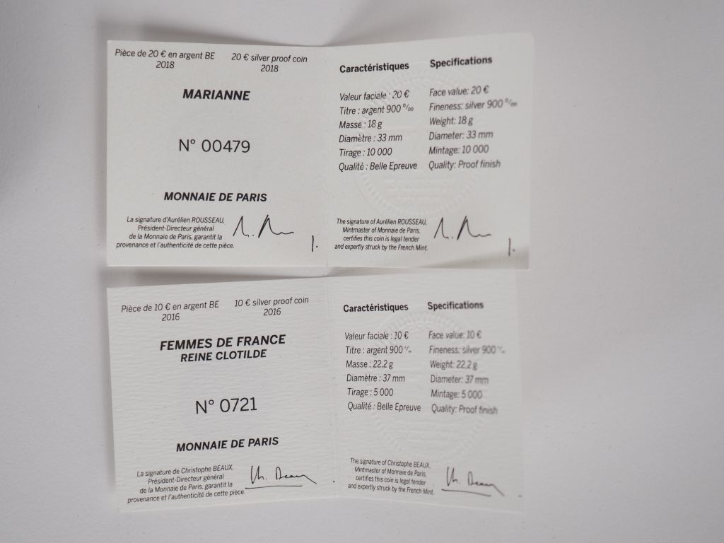 Ensemble de pièces de collection en argent dont : - Pièce de 20 euros Marianne en argent 900, monnaie de Paris. Poids 18 g. - Pièce de 10 euros Reine Clothilde en argent 900, monnaie de Paris. Poids. 22,2 g. - Pièce de 100 euros 2012 en argent 900, monnaie de Paris. Poids. 50 g. - Pièce de 100 euros Auguste Rodin en argent 900, monnaie de Paris. Poids. 50 g.